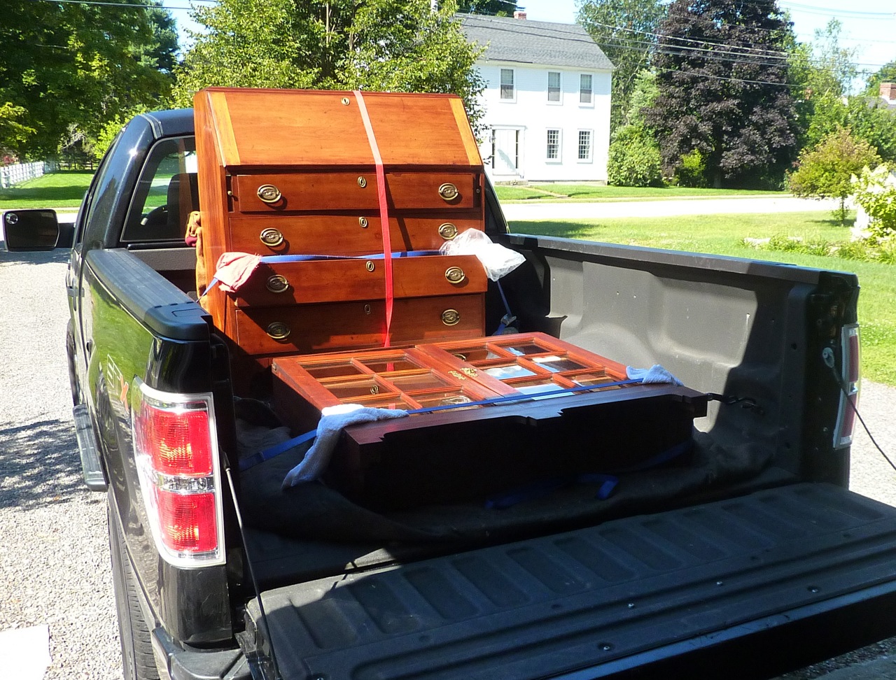To carry the look even further, when you open the doors and drawers old New England artifacts (maps, books, brochures, tin-types, etc..) will greet you and further grab your attention. Rather than displaying a static piece, it's staged with years worths of collected treasures. We purchased this piece from Jason Hackler at the New Hampshire Antique COOP some time ago. It's a great place to go, immerse yourself in the "antique culture" and learn. Even with free coffee and cookies, you'll never look at Jordan's Furniture quite the same way again.